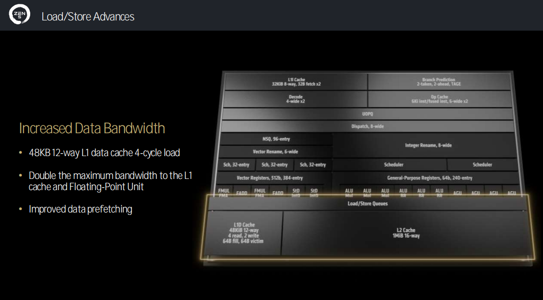 载入和存储部分,Zen5架构提升了数据带宽。它拥有48KB的12路一级数据缓存,提供4周期载入;一级缓存与浮点单元的最大带宽得到了翻倍;提升了数据预取效率。