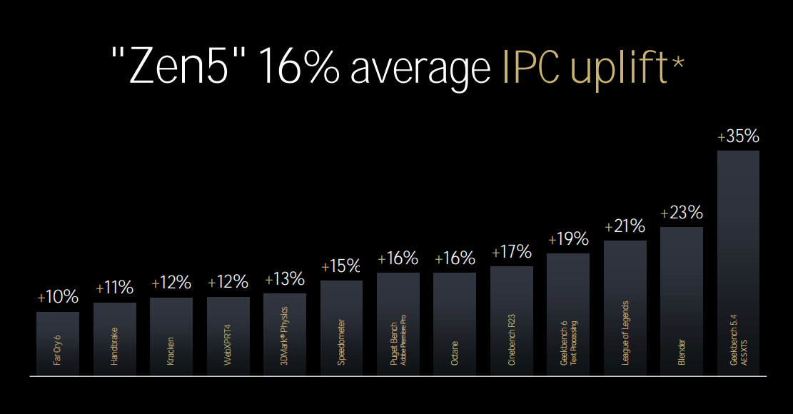 总而言之,就算普通玩家看不明白那么多专业术语,光是从图上也能看到Zen5对于处理器架构的各个部分都进行了升级,所有这些升级都是以提升IPC和执行效率为目标,这也意味着就算频率不变,Zen5的性能也会高出上代不少。