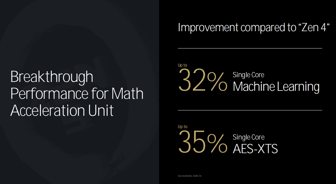 而在数学计算加速单元方面,Zen5的提升更是巨大。和Zen4相比,Zen5单核机器学习性能暴增32%,单核AES-XTS计算也剧增35%之多。
