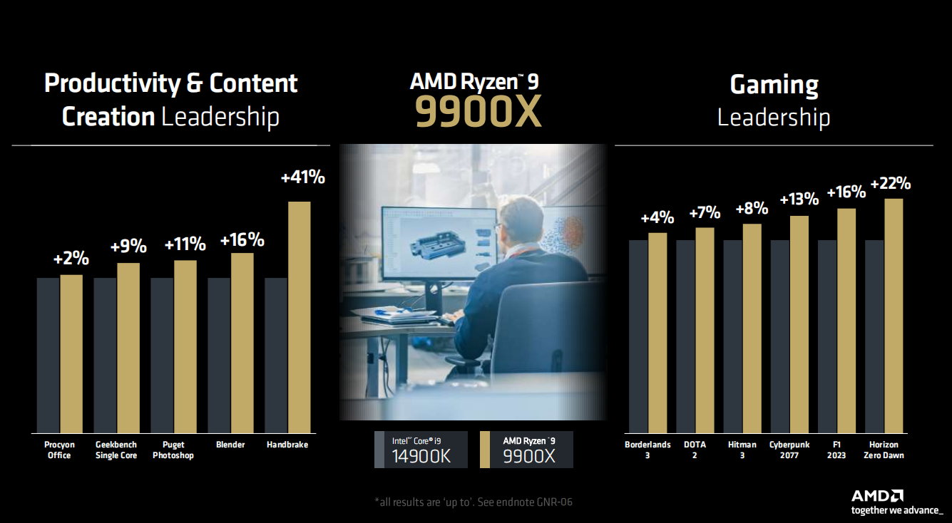 但是,没想到AMD在7月9日~10日于美国洛杉矶举行的2024 Tech Day大会上,官方竟然透露了锐龙9 9950X的大量测试数据和超频成绩……只见过不守规矩的KOL违反NDA保密协议偷跑,没想到AMD你浓眉大眼的居然自己玩起了抢跑啊!