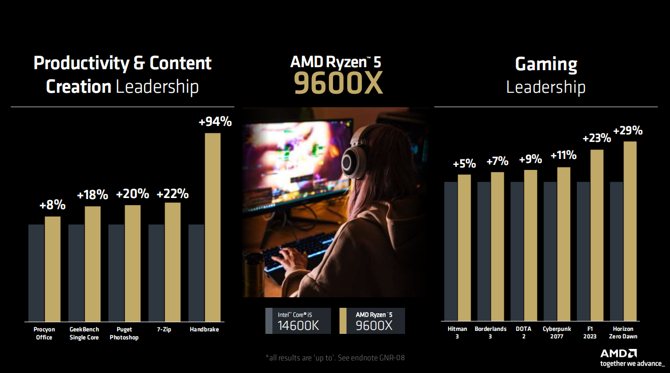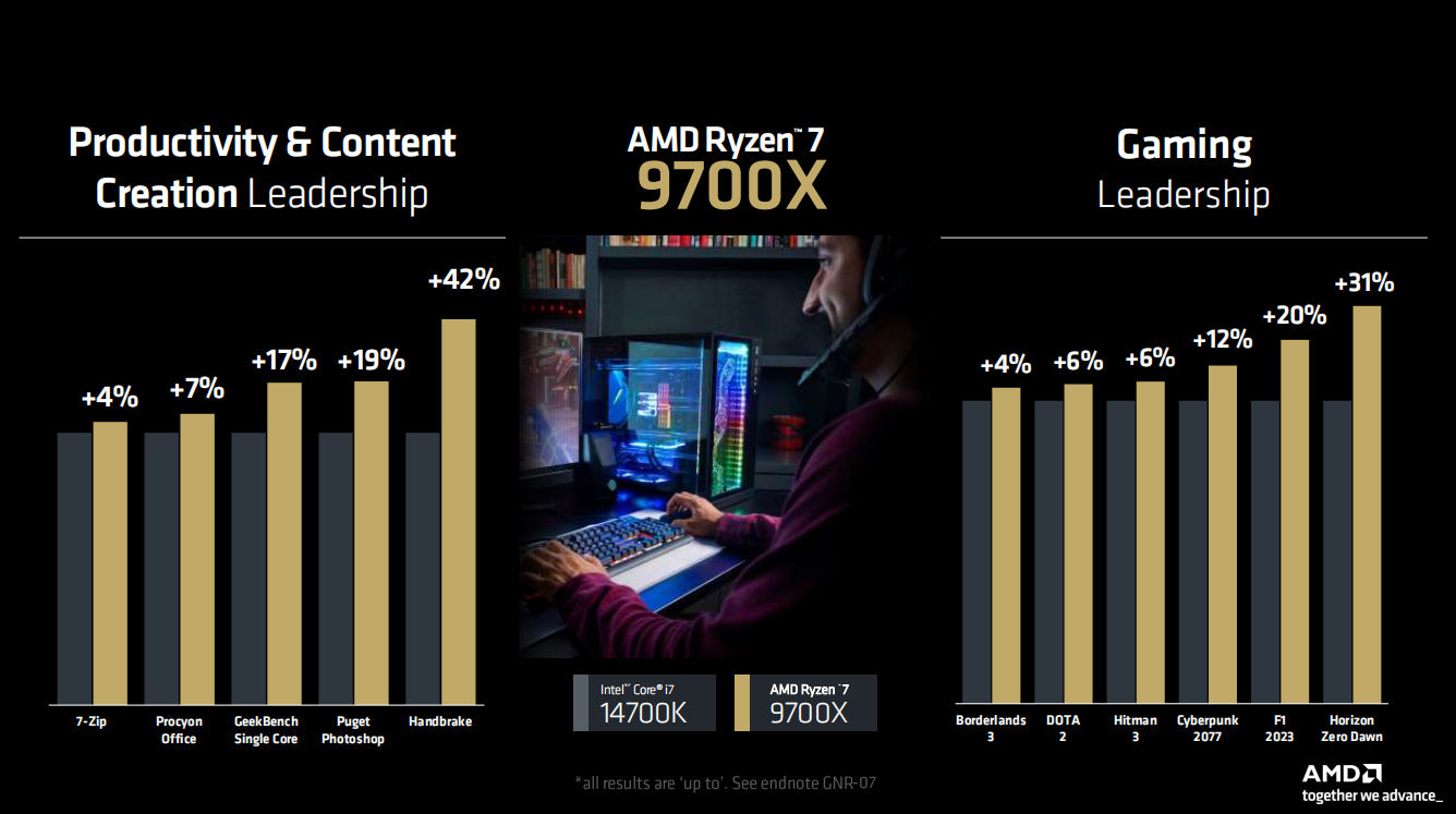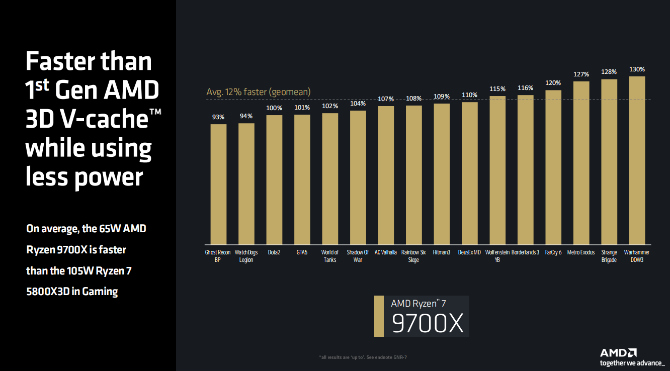 这里比较有意思的是AMD还给出了锐龙7 9700X与第一代X3D游戏处理器锐龙7 5800X3D的游戏性能对比。从成绩可以看到,16款游戏中,65W的锐龙7 9700X有14款都超过了105W的锐龙7 5800X3D,平均领先幅度为12%。对于一款2022年发布的处理器来讲,锐龙7 5800X3D能够有这样的表现确实已经不错了,在IPC升级两代之后,锐龙7 9700X超过它也是顺理成章的事。