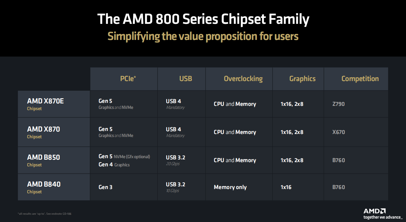 主板平台方面,虽说现有的AMD 600系主板是可以完美支持锐龙9000处理器的,但这次AMD还是为锐龙9000准备了新的座驾,那就是AMD 800系主板芯片。从规格来看,这次除了与600系旗舰与主流型号对位的X870E/X870/B850之外,还有一款针对入门级的B840(不支持处理器超频),暂时没有预料中的A820出现。X870E/X870提供了对USB4的支持,并且提供PCIe 5.0的显卡与SSD插槽,B850默认支持PCIe 5.0的SSD和PCIe 4.0显卡插槽(也可以选择将SSD的通道转给显卡使用),支持USB 3.2 20Gbps,这三款主板芯片都支持处理器和内存超频。