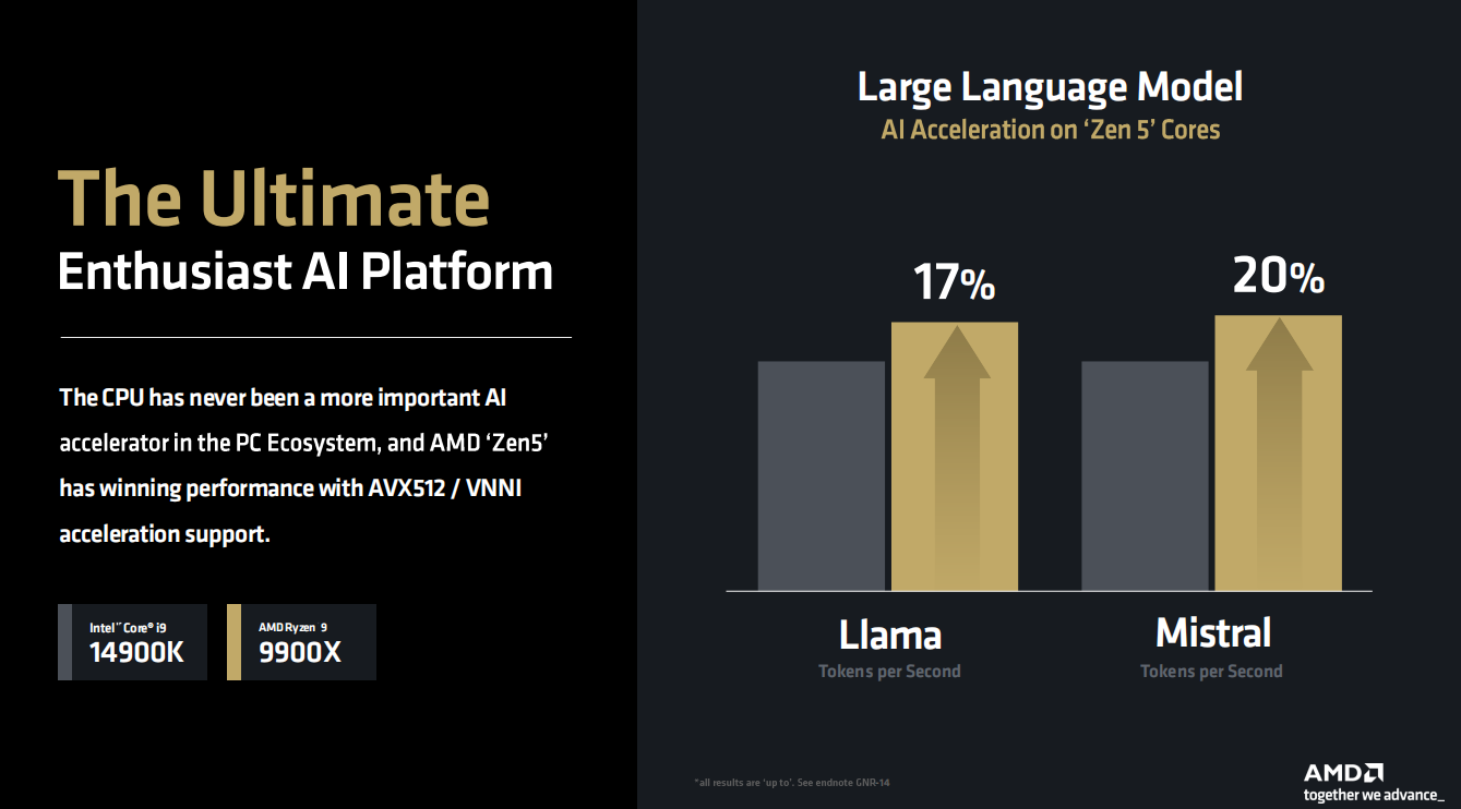 此外,由于锐龙9000系列支持AVX512/VNNI加速,这使得它在专业级AI平台中,加速LIama和Mistral大语言模型时的Tokens/s速度大幅领先对手,例如锐龙9 9900X就分别领先酷睿i9 14900K大约17%和20%。如此来看,搭建专业的AI平台,使用锐龙9000处理器也可以获得更佳的加速效率。