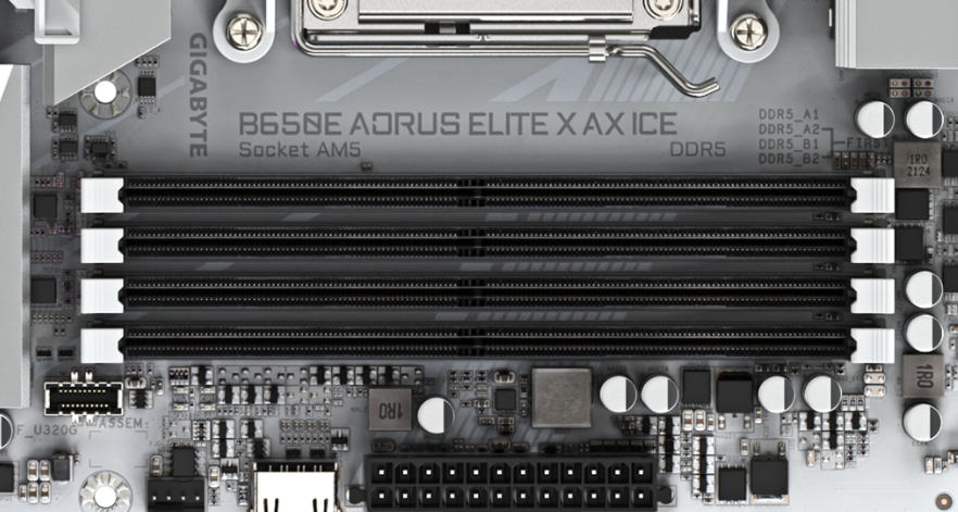 由于配备了6层2盎司铜低损耗PCB、优势电感与电容,内存布线也被放在PCB屏蔽层内,所以B650E冰雕X拥有了出色的电气性能,因此可以轻松支持DDR5 8000高频内存,稳定性也得到了可靠的保障。主板也支持技嘉独有的“内存高带宽”与“内存低延迟”D5黑科技,可以进一步提升内存性能。