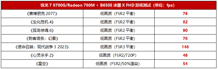 锐龙7 8700G最大买点就是内置了当下最强核显Radeon 780M,性能直逼千元级独显GTX 1650 D6,并且在最新的游戏大作中可以提供比GTX 1650 D6更好的特效支持度和更高的流畅度。从实测来看,锐龙7 8700G在B650E冰雕X上性能发挥完美,内置的Radeon 780M甚至可以让《赛博朋克2077》这样的硬件杀手游戏实现平均76fps的流畅帧率,多数主流3A游戏大作也可以保持80fps以上平均帧率,完全可以满足普通用户平时的游戏娱乐需求。