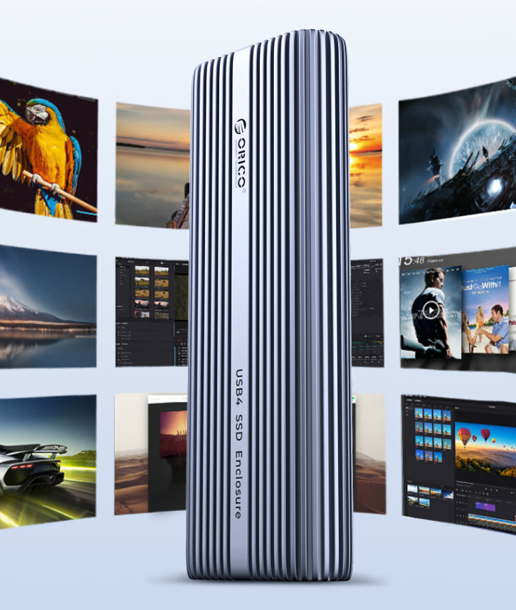我们选用了ORICO风冷大师M.2硬盘盒(ACOM2-U4)来测试此接口的性能,ORICO风冷大师M.2硬盘盒可以支持雷电3/4和USB4传输协议,最高带宽可达40Gbps,支持最大8TB容量,充分满足用户高速大容量的存储需求。ORICO风冷大师M.2硬盘盒配备了全铝合金外壳,表面设计了大量凹槽,形成密集的散热鳍片,从而提供了强大的散热性能。同时,在硬盘盒内部的PCB板上,ORICO还给它配备了主动散热风扇,此外,随硬盘盒还额外附赠了M.2导热贴和散热马甲,机身两端还设计了进风口和出风口。因此,在四重散热设计的加持下,它可以充分满足高速SSD满载工作时苛刻的散热需求,大大减少M.2 SSD过热掉盘的情况。