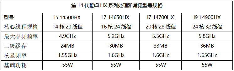2024年年初,英特尔发布了全新的第14代酷睿HX系列移动平台处理器,并成为2024年里最受用户关注的笔记本新硬件之一。规格方面,第14代酷睿HX处理器采用的是Intel 7工艺打造,其主要特点有:核显线程数量最高具备24核32线程;最高睿频可到5.8GHz;基础功耗为55W,最高睿频功耗157W,支持192GB DDR5内存。第14代酷睿HX处理器主要有5款型号,最高24核32线程。而在产品端,常见的处理器型号包括3款,即16核24线程的i7 14650HX、20核28线程的i7 14700HX,以及旗舰24核32线程的i9 14900HX,这三款处理器也成为2024年中英特尔第14代酷睿平台游戏本的主打型号。值得一提的是,不少搭载顶级i9 14900HX处理器的游戏本价格也在万元以内,对于追求超强处理器性能的用户而言,在主流价位内即有比较广泛的高性能处理器游戏本选择。
