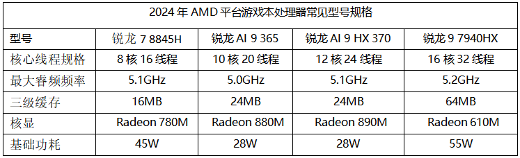 2024年,AMD平台游戏本的主要处理器一共分为3大系列,包括今年全新推出的锐龙8000 H系列、AI 300系列,以及已经沿用两年的锐龙7000 HX系列处理器。其中,锐龙8000 H系列处理器基于Zen4 CPU架构、RDNA3 GPU架构打造,最高规格是8核16线程,基础功耗45W,主力型号是锐龙7 8845H。锐龙AI 300系列处理器是AMD在今年全新推出的移动处理器,拥有Zen5+RDNA 3.5+XDNA2的全新三位一体全能AI加速架构,起步规格10核20线程,最高规格12核24线程,基础功耗为28W,常见型号是锐龙AI 9 HX 370(12核24线程)。而在顶级性能领域,AMD平台游戏本依然采用的锐龙7000系列HX处理器,最高16核32线程,代表型号是锐龙9 7940HX和锐龙9 7945HX。