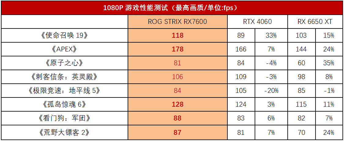 在实际游戏表现中,我们先来看看其“本职”负责的1080P游戏,从测试成绩中可以看到,ROG-STRIX-RX7600-O8G-GAMING在1080P分辨率下对比RTX 4060有着一定的领先优势。除了《原子之心》《刺客信条》等三款游戏落后之外,其他游戏中,RX 7600普遍领先RTX 4060 6%以上,领先幅度最大的《使命召唤19》达到了33%,平均比RX 6650 XT提升15%。帧率方面,RX 7600完全实现了高帧1080P游戏,参测两款电竞游戏的帧率都在110fps以上,其他3A游戏的帧率也超过80fps