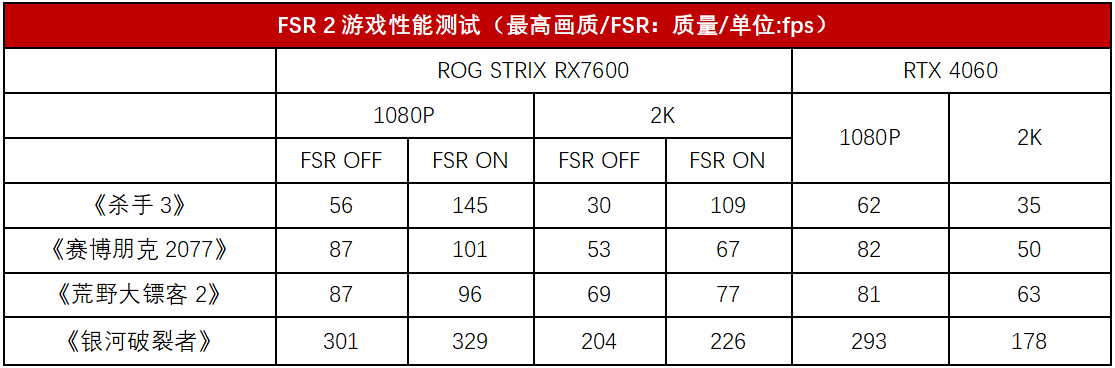 FSR是RDNA系列显卡的杀手锏功能,由于部署简单,很快就得到了众多主流游戏大作的支持,特别是采用时间超采样技术的FSR 2,能让显卡获得更精美的游戏画面和更流畅的游戏体验。这里我们选择了4款支持FSR 2的游戏进行了测试,可以看到在开启FSR 2后对帧率的提升是非常明显的,特别是《杀手3》的2K FSR性能达到原生的3.6倍,帧率直接从30fps暴涨至109fps,在其他游戏中也有9%~26%的提升。对于RX 7600这种甜品卡来说,FSR功能可以大幅提升游戏游戏帧率,对2K分辨率下游玩3A大作体验提升明显,实用性很强。