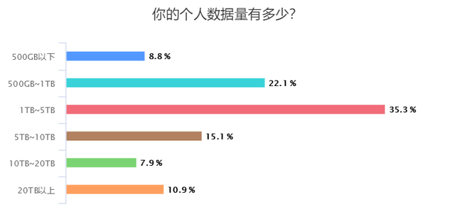 在5月时对用户数据量的调查中,数据量超过1TB的用户占比接近70%,数据量在10TB以上的用户超过18%,可见个人用户数据量随着日积月累的确增长很快,量级也不小。如果大多数是冷数据,编辑非常推荐大家直接选购机械硬盘来存储这些数据。珍藏的数据,一定要记得备份。选择机械硬盘,容价比更高。在实际使用中,超过100MB/s读取速度也能满足大多数使用场景流畅使用。另外,如今很多用户为了分享、同步更为方便,都选择搭建NAS存储中心了。挑选专为NAS优化的机械硬盘,不仅能提供高速传输体验,还能在7*24小时随时访问中保证稳定可靠。