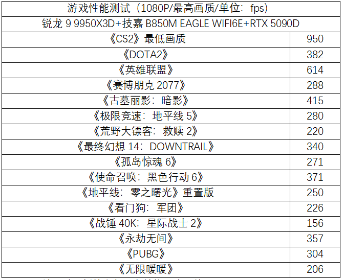 在大家最关心的游戏性能方面,技嘉B850M猎鹰主板搭配锐龙9 9950X3D处理器和RTX 5090 D显卡拥有非常不错的性能表现。作为目前最强的消费级处理器,锐龙9 9950X3D同时拥有顶级的生产力和游戏性能表现,从测试来看,锐龙9 9950X3D和技嘉B850M猎鹰主板的组合,可以提供“千帧级”游戏帧率,在绝大部分的游戏中都可以带来极为流畅的游戏体验,说明技嘉B850M猎鹰主强大的供电和散热设计可以充分发挥锐龙9 9950X3D的性能。