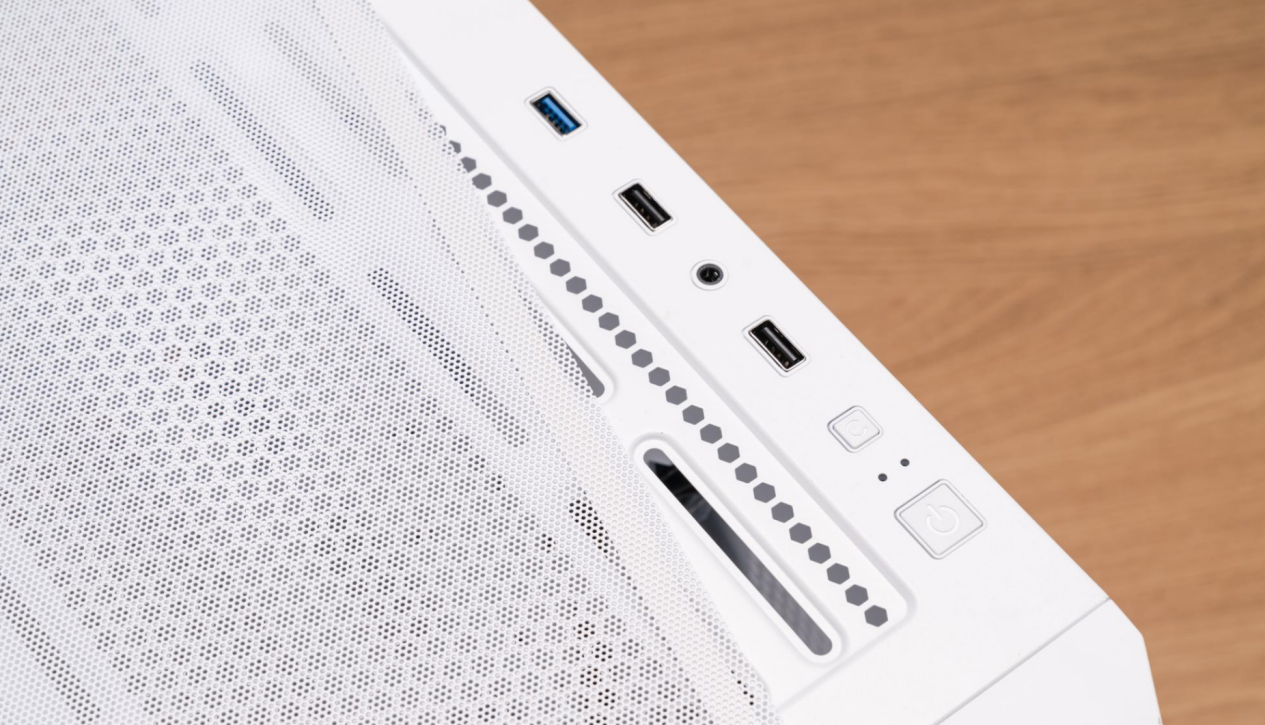 值得一提的是,机箱在上下盖部分采用的是双层包边工艺,能给全景侧透面板提供更好的保护,避免其在搬运、日常使用的过程中因为不慎磕碰导致钢化玻璃出现损坏。机箱的所有接口都位于顶部,提供了包括2个USB 2.0接口、1个USB 3.0接口、音频接口以及开关键和重启键,接口丰富、操作起来也很简单。