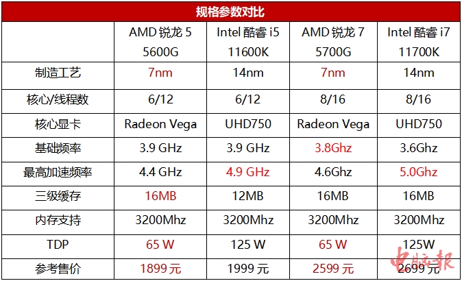 内存支持部分,AMD锐龙5000G保持了和锐龙5000系列相同的规格,默认支持DDR4 3200,通过超频也可以支持到更高频率。在定价方面,AMD锐龙7 5700G与AMD锐龙5 5600G也比对位的Intel酷睿i7 11700K与Intel酷睿i5 11600K更有竞争力。