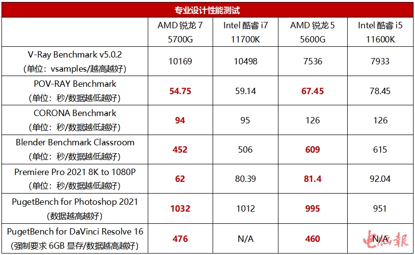 总而言之,AMD锐龙7 5700G在7项生产力软件实测中有6项的成绩都胜过了Intel酷睿i7 11700K,而AMD锐龙5 5600G相比Intel酷睿i5 11600K也有5项胜出、一项战平。综合来看,如果是要组建一套用来完成视觉设计工作的核显型设计师PC,AMD锐龙5000G确实是综合性能表现更好的选择。