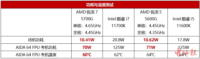 前面我们已经介绍过本次测试全部在锁定标准TDP的条件下进行,因此考机时的功耗基本上与TDP相差不大。由于AMD锐龙5000G采用7nm工艺,领先对手两代,因此在功耗控制方面的优势很大,这一点也在意料之中。温度方面,由于锁TDP的原因,4款处理器差别也不大,AMD锐龙7 5700G最为凉快,仅有60℃,而AMD锐龙5 5600G稍高一点(主板自动给的电压比较高,全核满载电压给到了1.3V以上,因此即便核数较少也跑到了71W,而AMD锐龙7 5700G全核满载电压还不到1.2V,可能是体质比较好的原因),大约为64℃。虽说我们使用了比较好的240水冷,但看锐龙5000G这个功耗与温度表现,用盒装原配的65W幽灵散热器也是可以默频满载正常使用的,这对于小型商用电脑和家用电脑来说也就意味着更低的散热要求与工作噪音,使用体验会更好。
