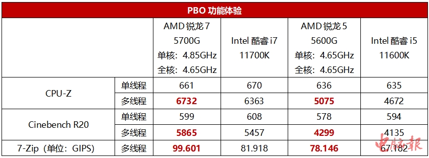 好吧,我们必须承认玩家对于APU的热情实在太高了,既然AMD锐龙5000G开放零售了,玩家买到手肯定也得可劲儿折腾。这里我们就帮大家先体验一下它的PBO功能好了。AMD锐龙5000G采用ZEN3架构,因此在PBO设置方面与锐龙5000系列没什么两样,照样支持PBO2的曲线调节,我们简单地将曲线负载设置成-25,PBO上限200MHz,防掉压设置为4级(防止低负载下电压不足导致蓝屏),然后进行性能测试。从得分来看,开启PBO后两款锐龙5000G性能都得到了明显提升。AMD锐龙7 5700G单核加速频率从默认的4.65GHz提升到了4.85GHz,单核得分已经与5GHz的Intel酷睿i7 11700K非常接近,全核心频率从4.45GHz提升到4.65GHz,多核心性能则进一步远超Intel酷睿i7 11700K。AMD锐龙5 5600G开启PBO后单核加速频率从4.45GHz提升到4.65GHz,CPU-Z单核分已经反超Intel酷睿i5 11600K,多核心性能优势也进一步拉大。由此可见,只是简单的PBO设置,就可以让锐龙5000G发挥出更强的性能,当然,喜欢手动超频的玩家也可以自行尝试挑战更高频率极限。