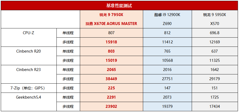 基准性能方面,可以看到锐龙9 7950X在技嘉X670E AORUS MASTER超级雕上发挥出色,除了CPU-Z单核一项,其他所有单核与多核成绩都超越了酷睿i9 12900K(可见当前版本的CPU-Z已经无法体现新架构的真正实力),特别是多线程性能,在7-Zip测试中甚至可甩开酷睿i9 12900K超过50%,其他多线程测试也有20%~40%的优势,性能非常强悍。当然,能做到这一点,技嘉X670E AORUS MASTER超级雕强大而稳定的供电系统也是功不可没的。