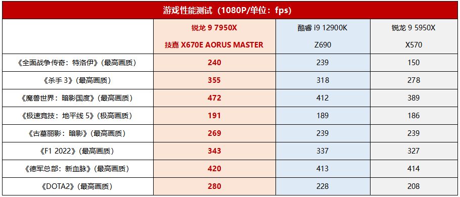 游戏性能当然是玩家最关心的部分了。得益于高IPC、高频DDR5内存的加持,锐龙9 7950X在8款主流游戏中都跑出了高于酷睿i9 12900K的平均帧率,特别是《杀手3》、《魔兽世界:暗影国度》、《古墓丽影:暗影》的优势都达到了10%以上,《DOTA2》优势甚至达到了20%以上。而处理器、显卡和内存能发挥出极致的性能,当然是依靠技嘉X670E AORUS MASTER超级雕出色的电气性能,所以对于发烧级玩家来讲,技嘉X670E AORUS MASTER超级雕也是打造极致游戏主机的上佳之选。