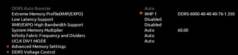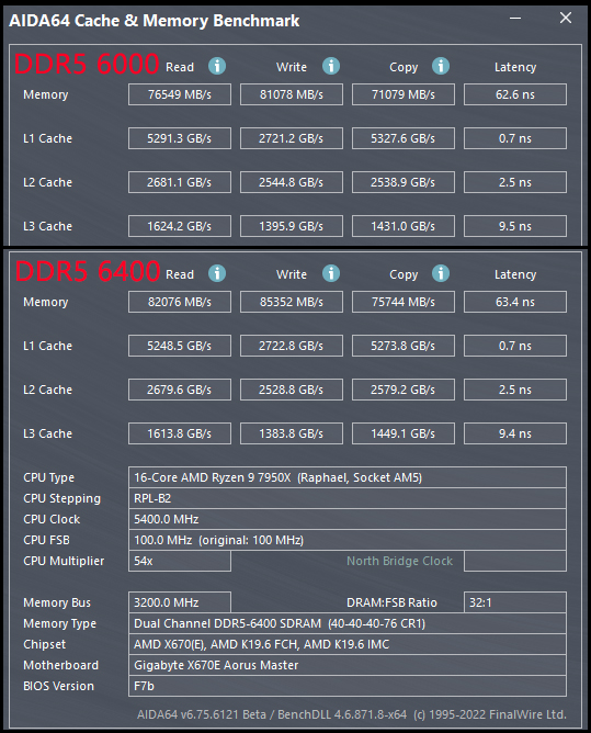 了解完技嘉X670E AORUS MASTER超级雕的实战性能表现,我们来看看主板本身的一些细节,首先是内存部分。前面已经介绍过,技嘉X670E AORUS MASTER超级雕对于锐龙7000系列搭配高频内存做好了软硬件全方面的准备,在主板BIOS中除了可以选择XMP/EXPO模式外,还可手动调节UCLK/MEMCLK比例,有1比1和1比2两种可选。而AMD官方表示DDR5 6000~DDR5 6400是锐龙7000的“甜点频率”,在这个频率下可以选择UCLK/MEMCLK=1比1的模式享受最低的内存延迟。经过我们尝试,只在默认设置下,测试平台所用的AORUS DDR5 6000内存即可直接调节到DDR5 6400使用,带宽进一步提升。可见,技嘉X670E AORUS MASTER超级雕在高频DDR5内存支持方面是非常强悍的,特别适合追求极致内存响应速度的发烧级玩家。