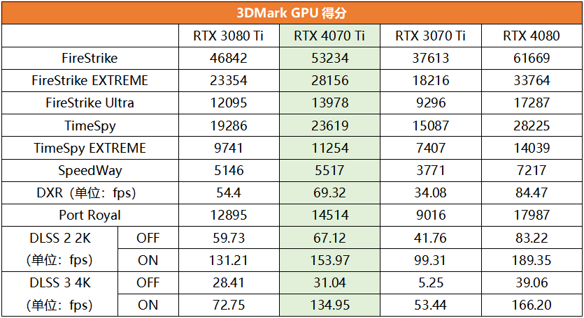 照理我们首先运行的是基准测试软件《3DMark》。在主要考查DX 11性能的FireStrike的三个项目中,RTX 4070 Ti在三个项目中,FireStrike EXTREME和FireStrike Ultra中的得分都比RTX 3070 Ti至少领先了50%,甚至比RTX 3080Ti也高出不少,表现抢眼。TimeSpy项目主要考验的是DX12性能,RTX 4070 Ti实现了23000以上的得分,提升幅度在56%以上。在DX12U专属的SpeedWay测试中,RTX 4070 Ti相对RTX 3070 Ti高出46%,比RTX 3080 Ti高出7%。