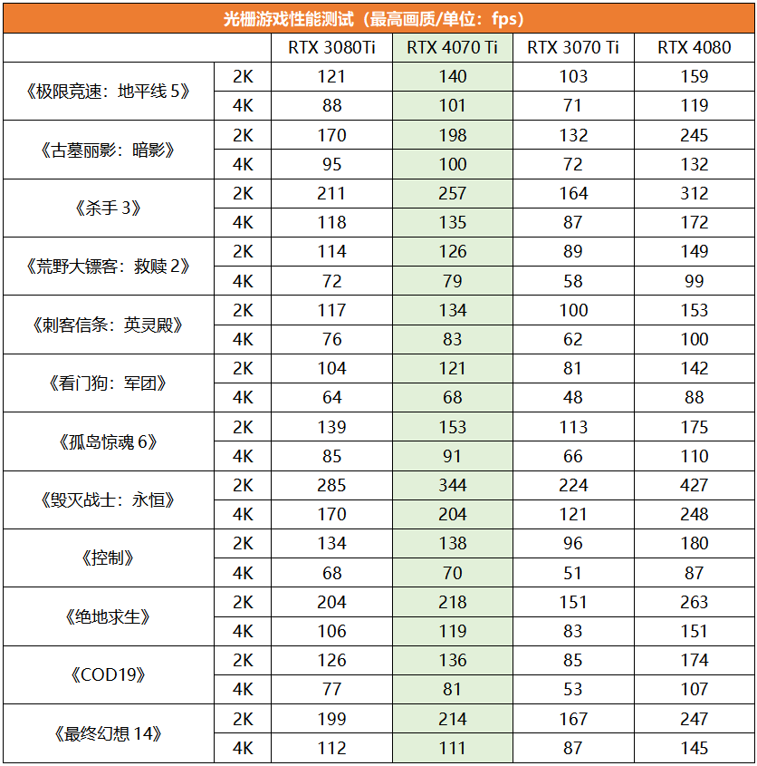 总的来说,在不开启光追的条件下,RTX 4070 Ti轻松驾驭现有主流游戏大作:2K分辨率下可以轻松提供120fps以上的平均帧率,就算是在4K分辨率下,所有游戏的平均帧率可以达到60fps以上,半数游戏可以过百帧。这样的实际表现,不但比上一代RTX 3070 Ti强不少,甚至比RTX 3080 Ti也要更强一些,这也是比较符合基准性能测试结果的