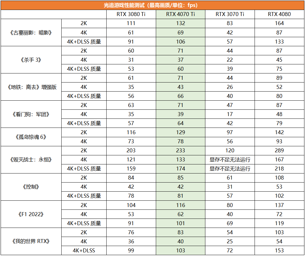 考虑到RTX 4070 Ti的光追单元和张量单元数量都要多于RTX 3070 Ti并领先了一代,在光追测试中的表现将其远远地甩在了后面。我们可以看到,在《古墓丽影:暗影》、《杀手3》、《地铁:离去》增强版、《看门狗:军团》、《孤岛惊魂6》、《控制》等游戏中,即便是开启了DLSS,画面的平均帧率依然不到60fps,甚至在运行《毁灭战士:永恒》时,还出现了因显存不足无法运行的情况。由此可见,RTX 4070Ti和RTX 3070 Ti之间的光追游戏性能有着比较明显的差距。