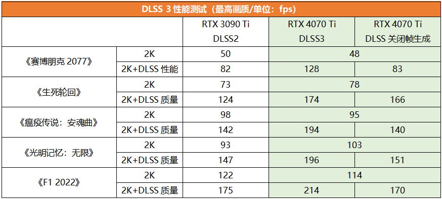 《生死轮回》中RTX 4070 Ti开启DLSS 3后,画面帧率从78fps提升到了174fps,帧率提升近达到了96 fps,RTX 3090 Ti开DLSS 2的话只有124fps。《瘟疫传说:安魂曲》原生2K最高画质下RTX 4070 Ti能跑到95fps,开DLSS 3后暴增至194 fps。《光明记忆:无限》开启DLSS 3后,RTX 4070 Ti的帧率能跑到196fps,比原生2K多了93fps,提升幅度也是将近100%。《F1 2022》中,RTX 4070 Ti原生画质可以跑到接近120fps,开启DLSS 3后帧数接近翻倍。