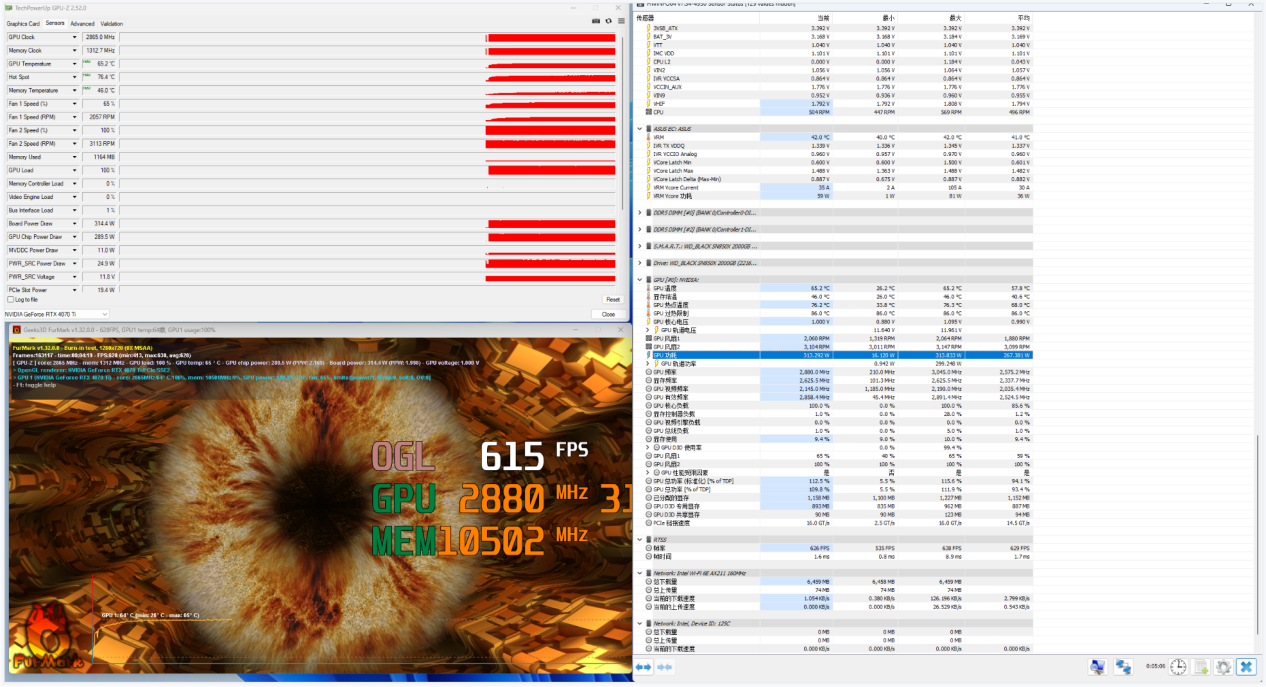 超频后再进行FurMark考机测试的话,频率则从2700 MHz提升到了2865MHz,此时显卡功耗提升到了314.4W,不过核心温度此时只有65.2℃,依然是非常凉爽的水平。