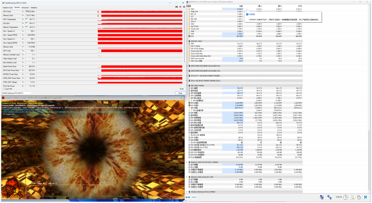 默认设置下使用FurMark考机,可以看到索泰RTX 4070Ti-12GB X-GAMING OC的GPU考机频率达到了2700 MHz,整卡功率达到了284W,接近官方给出的285 W整板功率上限。同时,我们也注意到满载考机的情况下,GPU最高温度不过59.7℃,显存温度也仅有44℃,可见索泰RTX 4070Ti-12GB X-GAMING OC的散热系统确实非常出色。