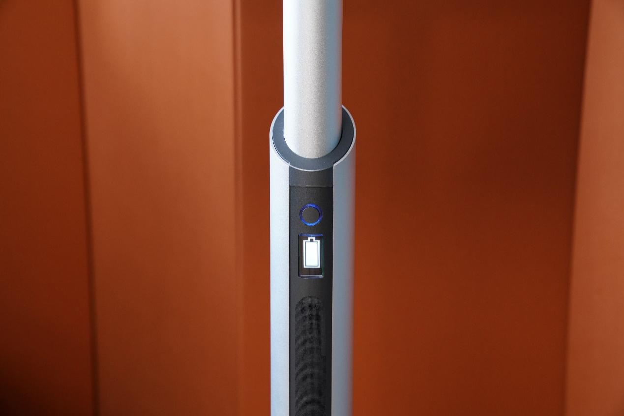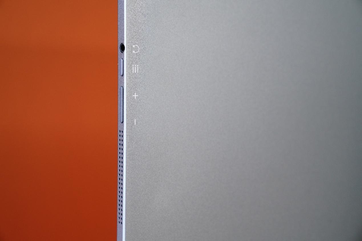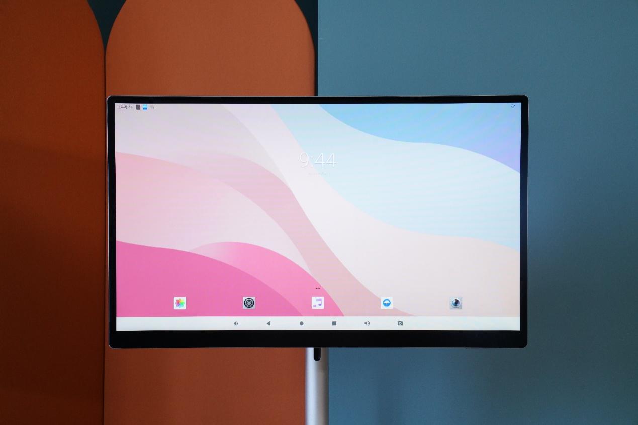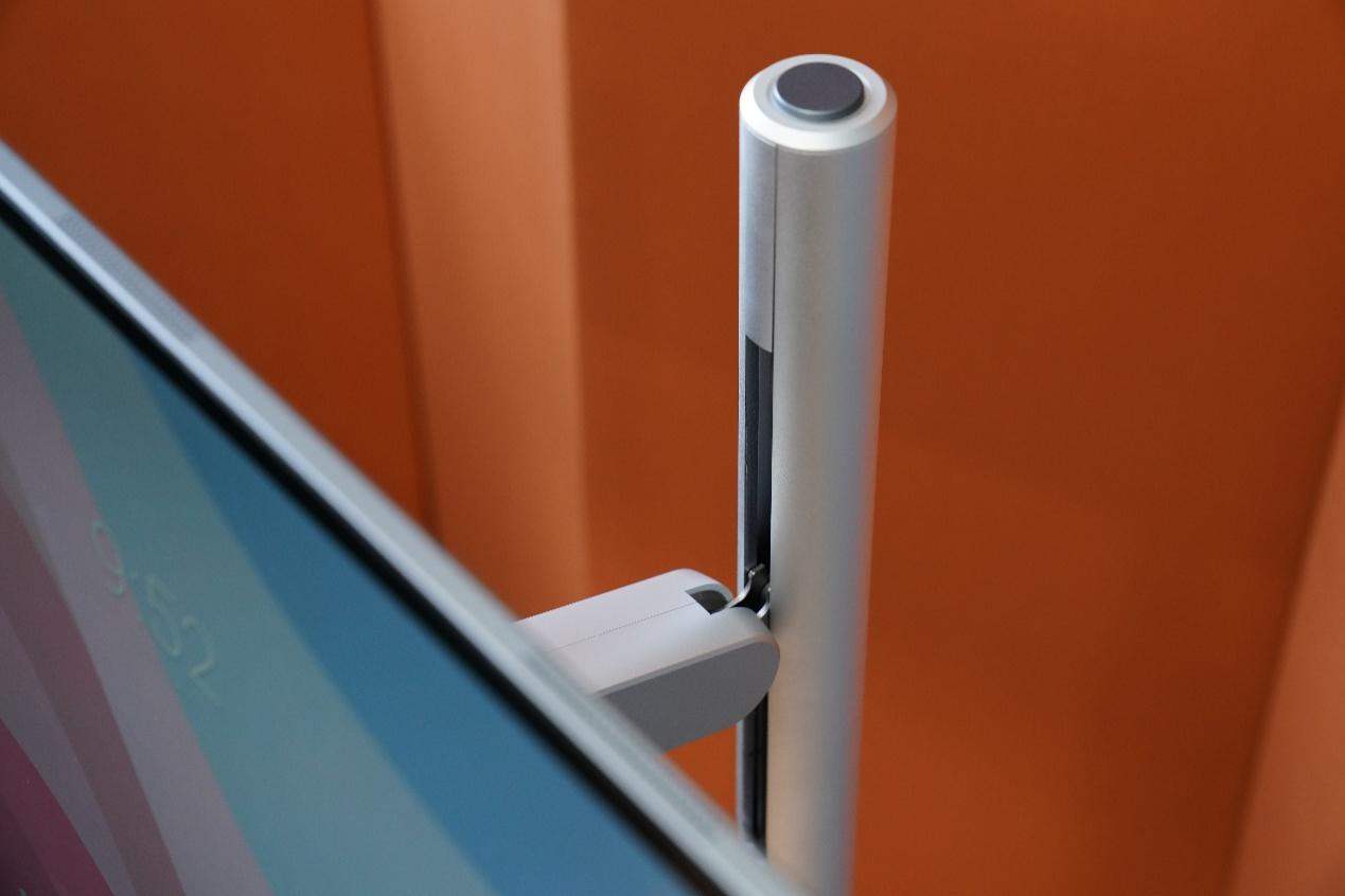 所有的线缆都隐藏在底座和支架内部,同时其内部还隐藏了一套4扬声器的声频系统,包括2个全频发声单元和2个低音单元,将声频单元安置在支架上而不是屏幕上的好处是无论屏幕是横屏还是竖屏都能获得一致的声频体验。另外,电源按钮和电量标识也独立设置在支架上,使用起来更加方便顺手。