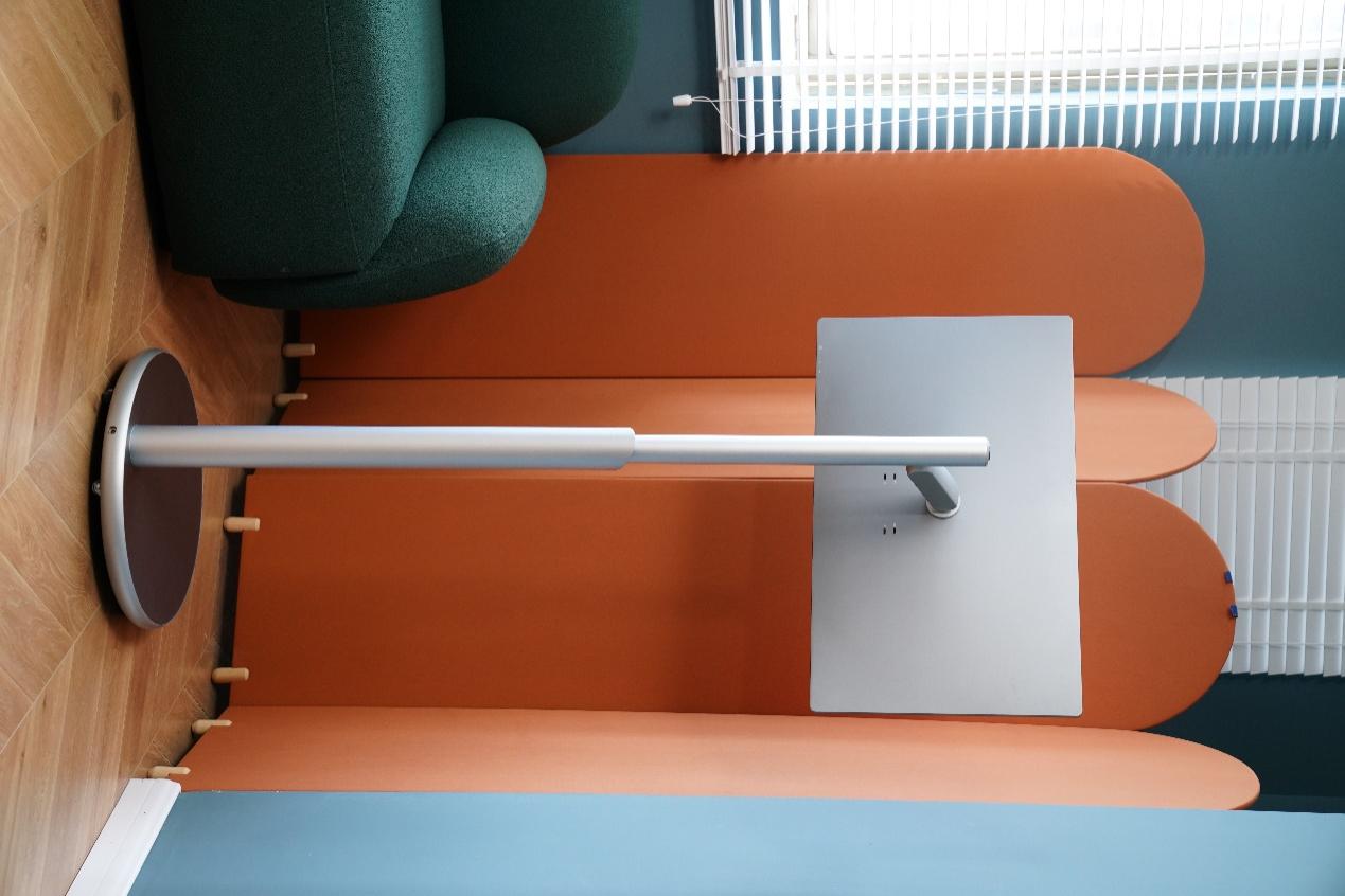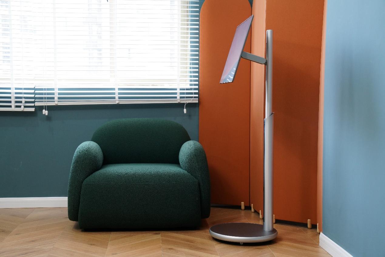 雕塑家Be With Me移动智慧屏的整体结构也非常简洁,下方是一个直径约40cm的圆形底座,底部设计了5个静音滚轮,方便玩家移动且不会有太大的噪音。支架采用粗细不同的两段式结构,高度约为1.25米,使用铝合金一体成型工艺打造,质感不错。