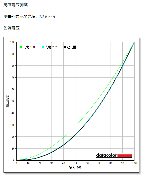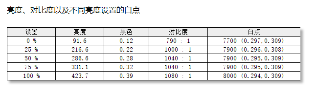 亮度方面,该屏幕的最高亮度为423nit左右,对比度为1080:1。实测其色调响应(Gamma)为2.2,和标准的Gamma2.2曲线非常贴合。在默认的6500K色温设置下,其白点在7900K左右,画面相对偏冷。