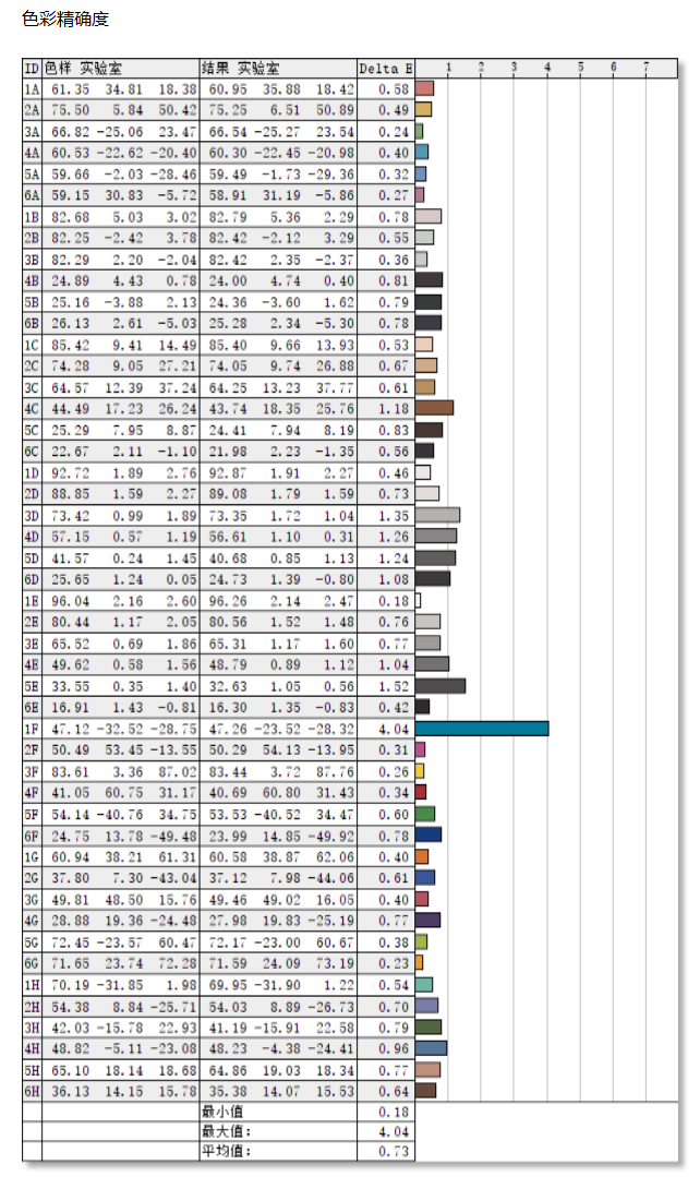 通过48色的色准测试,其最大色差为4.04,最小色差为0.18,平均色彩精准度ΔE为0.73,色准表现非常优秀。
