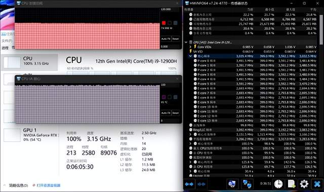 处理器性能测试:灵耀X双屏Pro 2022搭载的是英特尔第12代酷睿i9 12900H处理器,具备14核20线程的规格。如下图所示,室温26℃时,在Aida64中单烤处理器(单烤FPU),在高效模式下烤机持续30分钟以上,处理器稳定跑在75W/3.15GHz的状态下,处理器温度则是95℃左右,有小幅度超标性能释放。