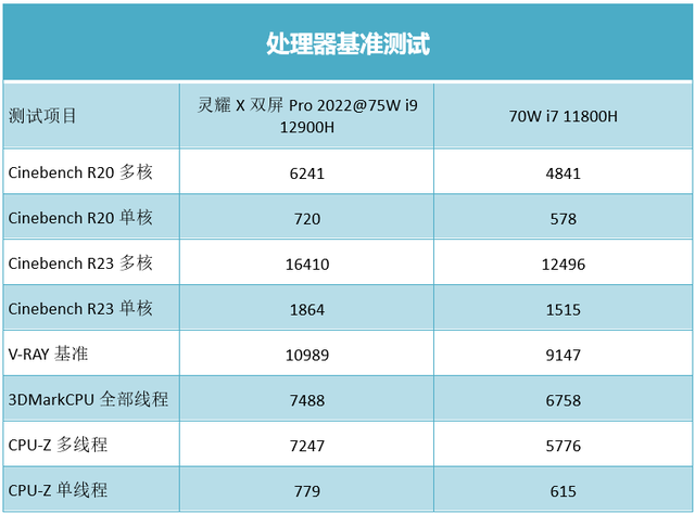 灵耀X双屏Pro 2022的处理器基准测试比较强劲,在Cinebench 系列测试中,相比上一代机型,75W的i9 12900H多核性能提升大概在30%左右,考虑到功耗接近,这个提升幅度不错。另外值得一提的是,第12代i9 12900H的单核性能非常亮眼,在Cinebench R20单核中跑到了720pts,在CPU-Z单线程中则跑到了779,均是目前移动平台里处于前列的分数。