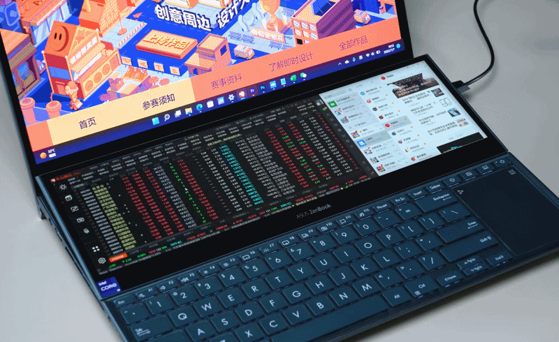 ▲至于其他的常规屏幕扩展类应用,灵耀X双屏Pro 2022就更不在话下了。比如在文章开头提到的上网,两块屏幕“融合”可以获得更大的显示面积,浏览网页一次性可以获得更多的阅读内容。而即便同时面对看视频、聊天、看股票、处理表格等多种应用并行使用的需求,灵耀X双屏Pro 2022也能轻松解决,主屏上网工作,副屏还能如上图一样“摸鱼”刷抖音。