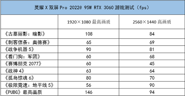 在FHD最高画质实测中,灵耀X双屏Pro 2022基本都能以60fps以上的平均帧速稳定运行(《极限竞速:地平线5》由于设置的是默极端画质,导致显存占用超过了6GB,“爆显存”之下对帧速影响较大),而且多项游戏帧速比较接近140W的RTX 3060,比如《古墓丽影:暗影》、《看门狗:军团》、《赛博朋克2077》等,如前面所言,搞定FHD最高画质,灵耀X双屏Pro的确无压力。而在2560×1440分辨率预设高画质下,除了《赛博朋克2077》意外,测试游戏都能60fps以上的较高帧速,流畅度也不错。