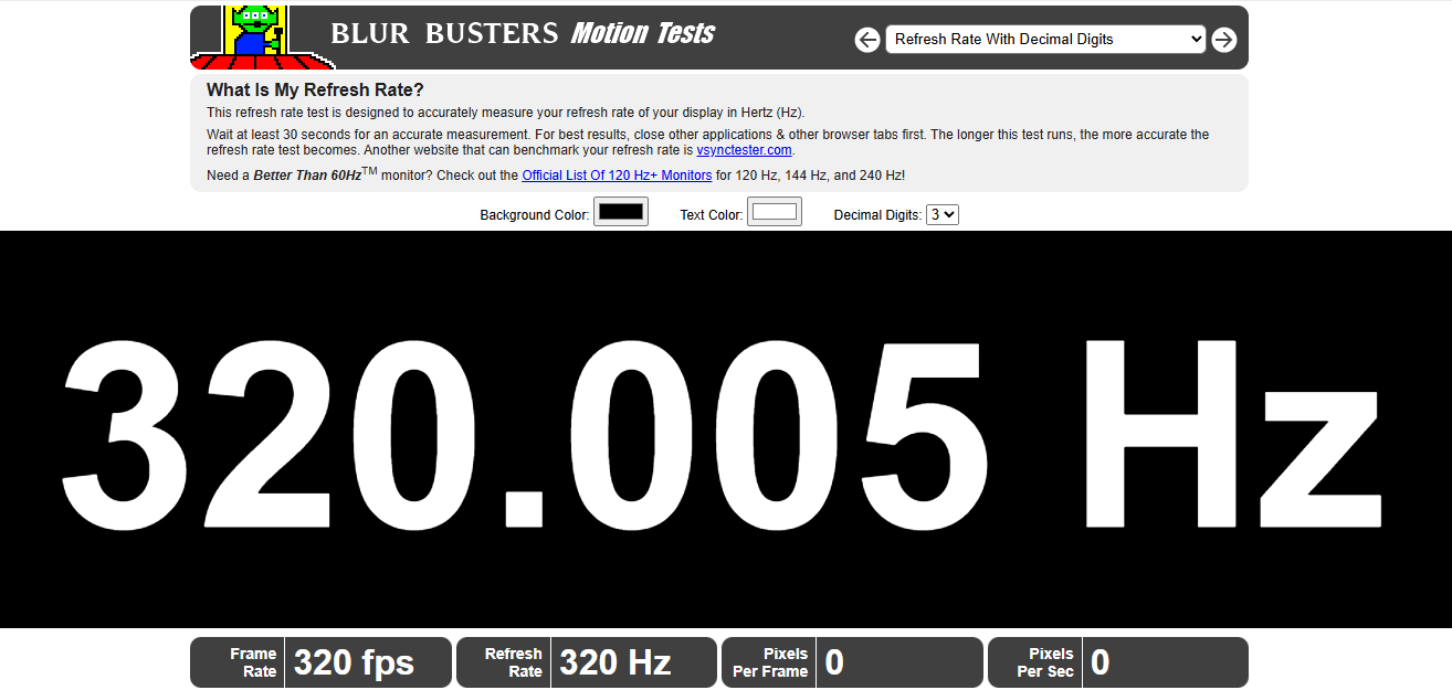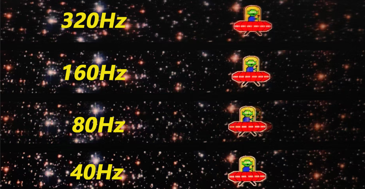 我们用UFO TEST对画面进行了测试,在刷新率测试中,显示产品屏幕的刷新率一直稳定在320Hz,表明其刷新率表现一直很稳定。在画面流畅性的测试中,通过相机抓拍的情况来看,在300Hz的高刷新率下,显示器没有出现跳帧情况。同时我们也看到,虽说固定机位拍摄UFOTEST很难表达超高帧率下实际观看效果,但可以较好的表达不同刷新率下画面运动的位置带来的体验上差距。320Hz刷新率下的画面会比160Hz在流畅性上有提升,相信这对于电竞高手来说,在操作上会有加成。