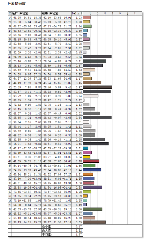 雷神CF25F300-W在出厂时经过了色彩校准,在色彩精准度方面应该表现不错。果然在48色方案的色彩精准度测试中,显示器的ΔE平均值仅为1.67,也是符合产品参数中宣称的ΔE平均值≤2的标称值,这个测试表明该显示器的色彩还原能力不错。
