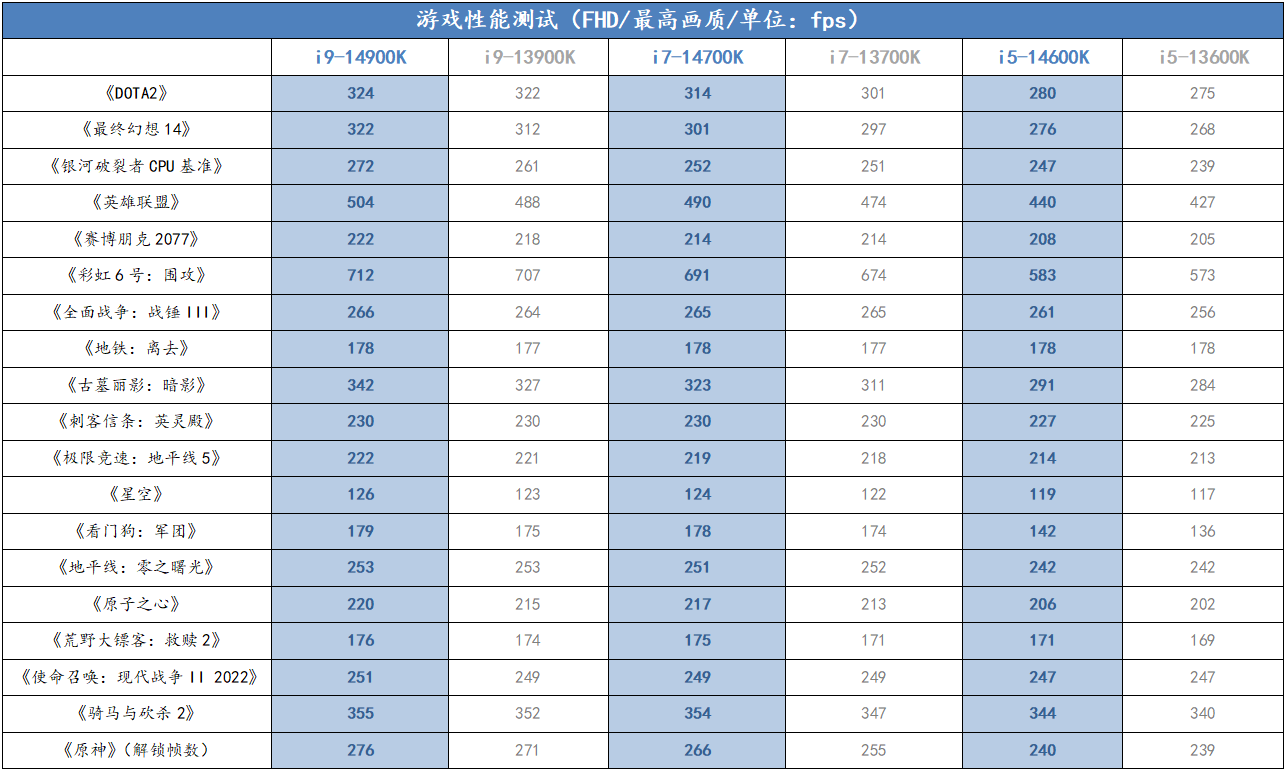 再来看看游戏玩家最关心的游戏测试。我们选择了19款热门游戏进行测试,综合19款游戏的帧率表现来看,i9-14900K相对i9-13900K最高提升幅度可达4.59%,i7-14700K相对i7-13700K最高提升幅度可达4.32%,i5-14600K相对i5-13600K最高提升幅度可达4.41%。总的来说,选择酷睿14代确实可以为玩家带来更流畅的游戏体验。