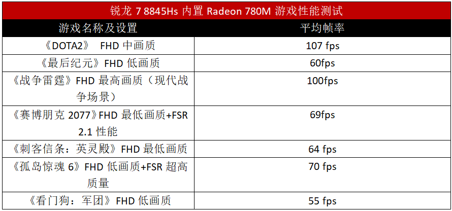 从测试来看,Radeon 780M的性能足以满足FHD分辨率下流畅运行3A游戏大作的需求,即便是《赛博朋克2077》《刺客信条:英灵殿》《孤岛惊魂6》等要求苛刻的游戏大作,平均帧率也能达到60fps以上,最近大火的《最后纪元》也能达到60fps,至于《DOTA2》《战争雷霆》这类电竞网游更是达到100fps以上。