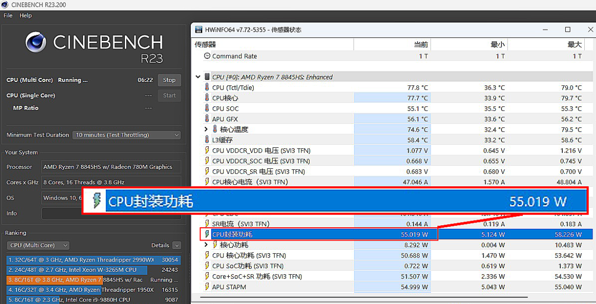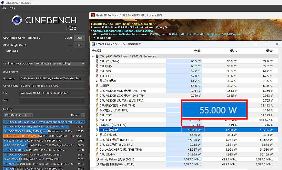 ▲Cinebench R23 + FurMark双考,输出功率也可达到官方标称的55W上限