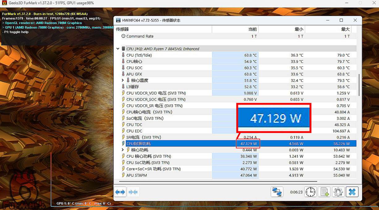 前面已经介绍过,玄智星2024青锋可以让锐龙7 8845HS以55W的功率输出,从考机测试来看确实如此。使用Cinebench R23单考处理器,封装功率可达55W;FurMark单考内置GPU,封装功率可达47W;双考模式下,封装功率也是标称的55W。同时,我们也可以看到,极限考机的状态下,锐龙7 8845HS的核心温度最高为79℃,对于一款轻薄本来讲,这个温度控制能力相当不错,长时间工作也完全可以保证稳定。
