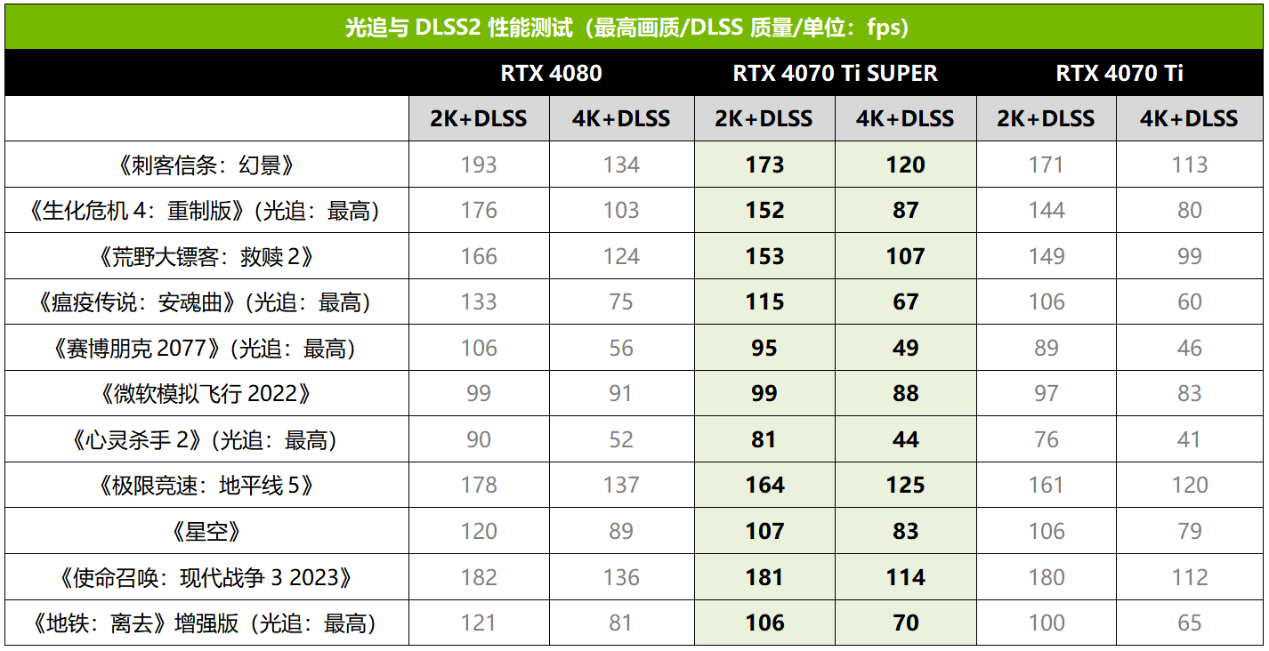 综合整个游戏测试的情况来看,RTX 4070 Ti SUPER相对RTX 4070 Ti总体有大约10%的性能提升,也差不多能达到RTX 4080大约87%~90%的性能,定位确实是相当精准的。同时,RTX 4070 Ti SUPER在2K极限画质设置下可以让主流光追游戏大作保持极高的游戏帧率,开启DLSS之后更是可以达到极致流畅的程度,确实称得上是2K光追游戏高帧率旗舰。当然,就算是把分辨率提升到4K,RTX 4070 Ti SUPER也可以让绝大多数游戏保持在平均60fps以上,并且还有DLSS 3/3.5(包含光线重建)黑科技加持来进一步提升帧率与画面质量,体验也是非常不错的。