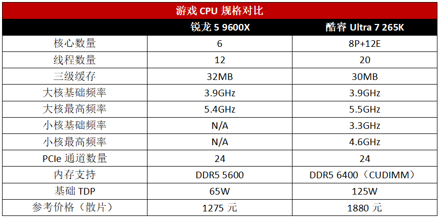 因为锐龙5 9600X只是锐龙9000系中的中端产品,对上高端定位的酷睿Ultra 7 265K,由于定位上的明显区别,特别是在核心、线程数量上出现了较大的差距。但不同应用对CPU规格的要求并不一样,就游戏而言,影响其发挥的不仅仅是核心数量,大核频率、三级缓存大小甚至是内存延迟等因素都会影响到性能的发挥,所以在选购时我们就需要对每一项进行细致的对比。