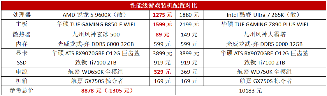 在游戏性能有优势的前提下,锐龙5 9600X当前散片价格不过1200多元,与酷睿Ultra 7 265K有着600元以上的优势。前面我们也提到该CPU对搭配硬件的要求也相对较低,所以锐龙5 9600X在主板、散热器以及电源上的花费更低,仅这三样又有了700元以上的价差。