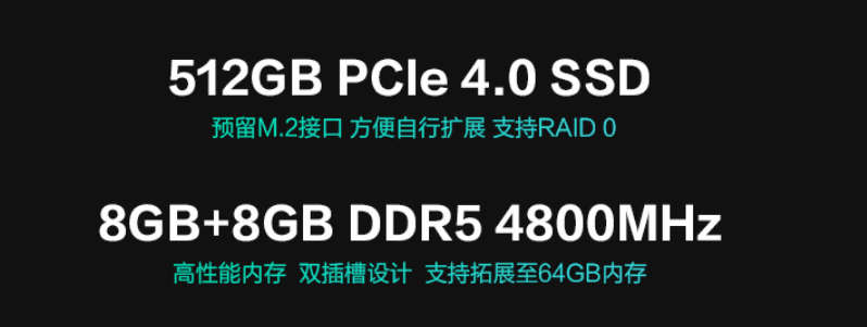 天选3Plus标配16GB DDR5 4800MHz内存+512GB PCIe4.0 SSD组合,日常应用和3A游戏到手即用,无需升级。而如果玩家有升级需求,该机预留了一个M.2 SSD位,内存则可替换升级,最高支持64GB,具有不错的扩展性。