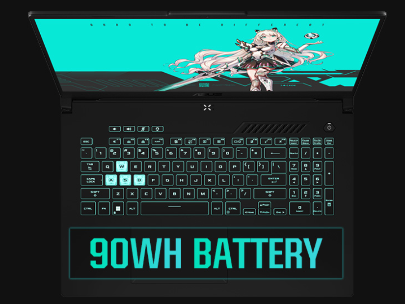 机身设计方面,天选3Plus外壳采用二次元动漫风,整机重量控制在了2.5kg左右,作为一款大屏游戏本而言,便携性不错,比一些15.6/16英寸的重型游戏本还轻一些。键盘支持RGB炫彩灯效,内置90Wh大容量电池,配合集显模式,续航更长。