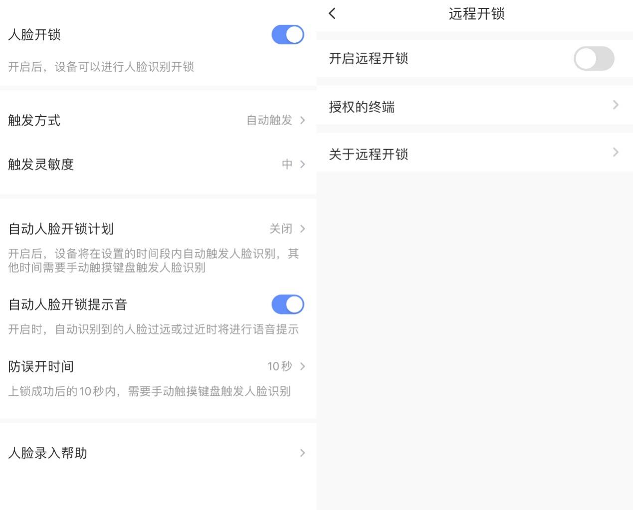 △萤石Y3000FVX双摄版,可以设置人脸识别的触发方式(自动触发、延迟触发、手动触发等),并可对开锁声音、触发灵敏度、防误开时间等细节进行个性化设置,同时用户可以根据需求开关远程开锁功能,使用时需要对APP的运行终端授权,安全更胜一筹